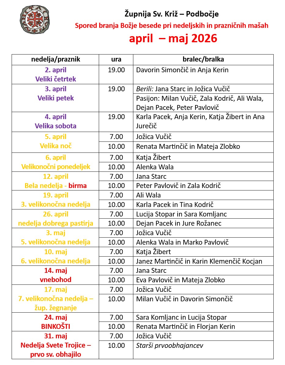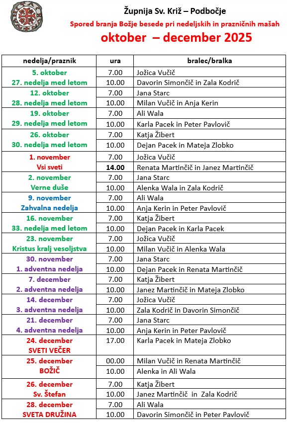 Za dostop do datoteke s sporedom branja beril pri nedeljskih svetih mašah in praznikih kliknite ustrezni gumb. Poleg sporeda so priloženi tudi napotki za bralce beril.